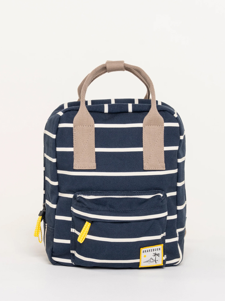 Made from heavy weight cotton canvas in a soft navy and cream nautical stripe combined with silver coloured hardwear and a textured neutral adjustable back straps. Our Classic backpack is the perfect bag and size for everyday use, it has a external front zip pocket, hidden back pocket for your valuable items, internally it has a padded small laptop/ tablet sleeve, slip pocket and zip pocket. Finished with a soft navy metal “Brakeburn branded bird”and pop sunshine yellow zip pulls.