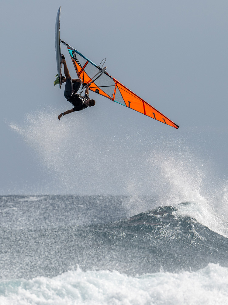 The Global’s outline carries a bit more width through the nose and tail compared to a Ho’okipa Quad, giving it additional stability and planing ability. The V-bottom shape starts with a slight V in the entry of the nose area that carries into a V with a slight double concave in its midsection, transferring into a clean V release out the tail. The rocker line focuses on early planing and fast acceleration. Combined with the V-bottom shape, we managed to achieve a turning ability that is comparable to other side-shore boards. The Global’s rail shape carries a slight edge with a medium tuck through the nose and midsection that turns sharp just behind the front foot area for ultimate early planing and good acceleration.