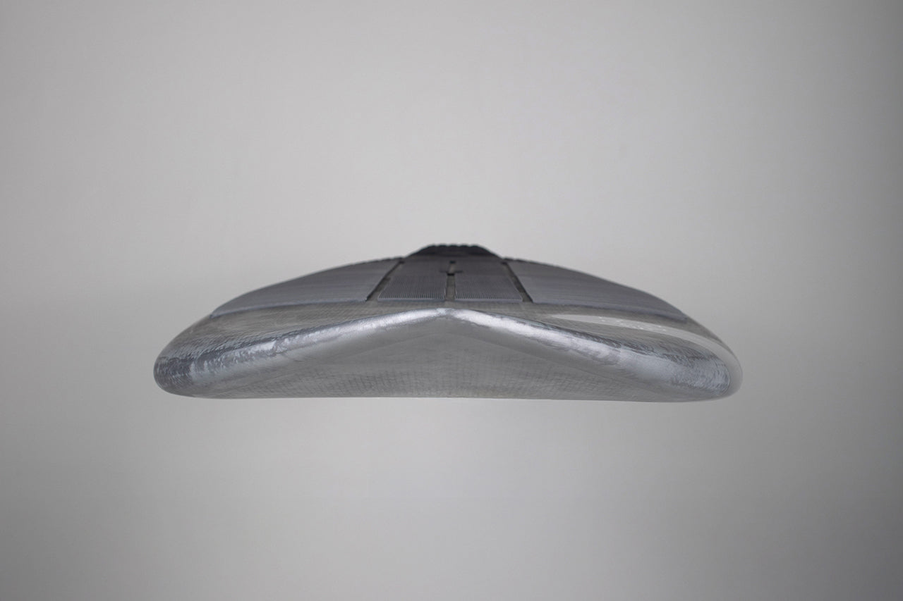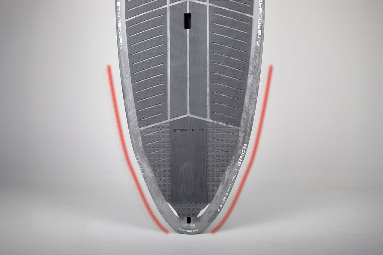 The Wing tail creates a break in the rail line, giving stability from the extra width forwards, while narrowing behind the wing for better control and response. The rails are kept thin at the tail for more manoeuvrability.