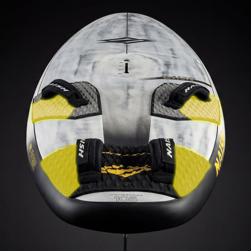 A slightly wider, higher-volume tail improves early planing and keeps the board supported through jibes. You get easier speed carry without giving up top speed.