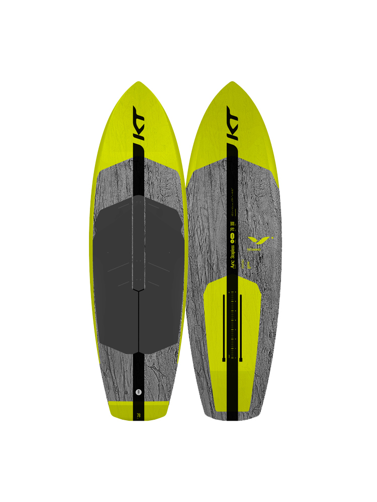 The Arc is a parawing focused design that also serves as a more stable midlength for winging and Foil Assist. Compared to the Super K2, it is slightly longer and wider, but significantly thinner, which makes it feel way lighter and responsive in the air. The recessed cockpit deck and concaves unlock a significant amount of static stability that helps riders move from kneeling to standing in light winds or messy water. Once flying, these subtle concaves offer more leverage over the foil, so surf style carves feel more controlled, swoopy, powerful, and pitch stable.